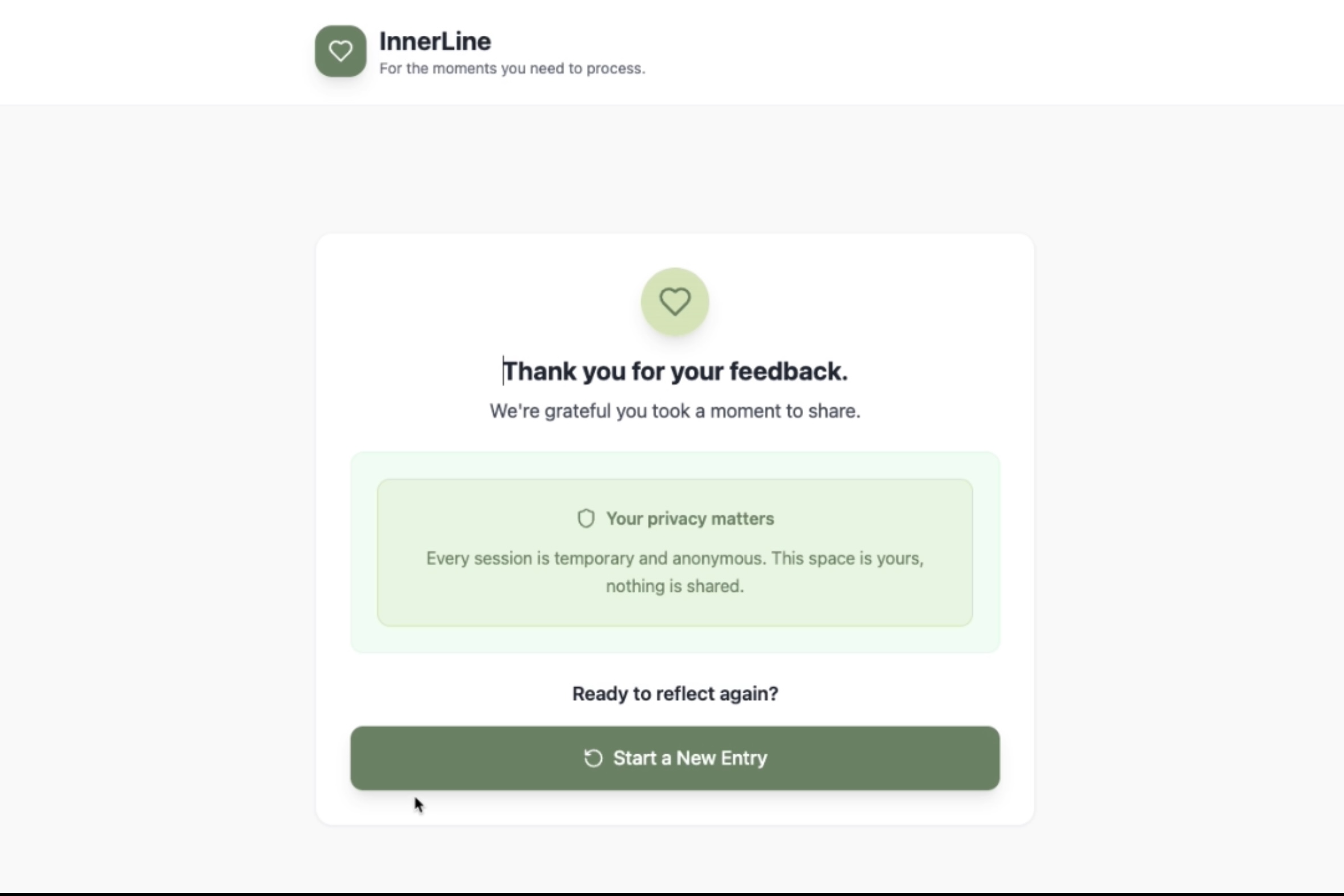 Innerline gives you a quiet space to type out what you’re feeling and receive a gentle, AI-powered response in real time. It isn’t a replacement for therapy, and it doesn’t try to fix everything. Its purpose is simple—to offer a quick, supportive space where you can pause and reflect.